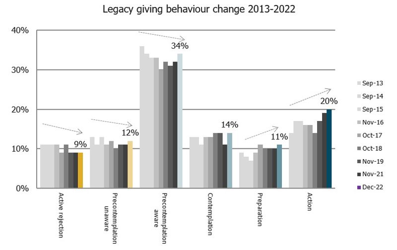 The tracking study, which follows Prochaska’s Stages of Change model, shows forward movement over the years from donors’ rejection and lack of awareness through to awareness, contemplation, preparation and action (leaving a gift).**