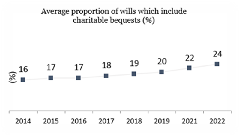 Now almost a quarter (24%) of Wills handled by UK legal advisers include a donation to charity; showing steady growth and long-term change over the past decade, up from 16% in 2014.